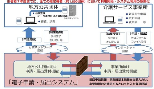 厚生労働省において、介護分野の文書に係る負担軽減に関する取組を行うため、オンラインによる指定申請等が可能な「電子申請・届出システム」の運用が開始されているところです。